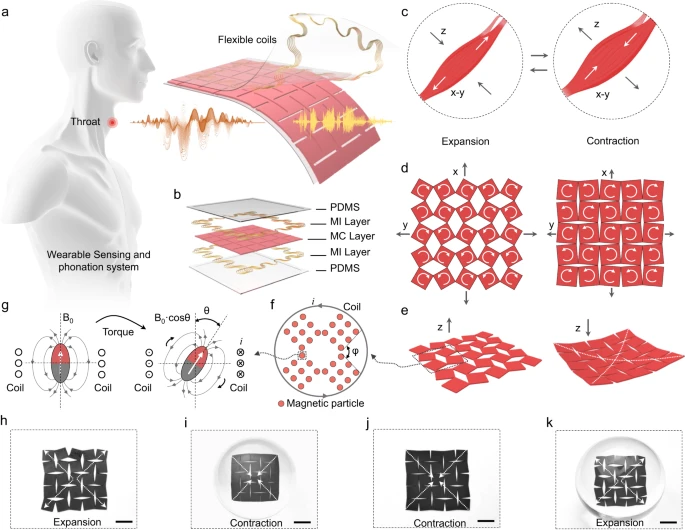 The self-powered wearable sensing-actuation system is based on soft magnetoelasticity. Weighing only 7.2 grams and boasting a skin-like modulus, this lightweight device is stable against skin perspiration and offers a maximum stretchability of 164%. Its sensing component effectively captures the movement of extrinsic laryngeal muscles and converts them into high-fidelity electrical signals.