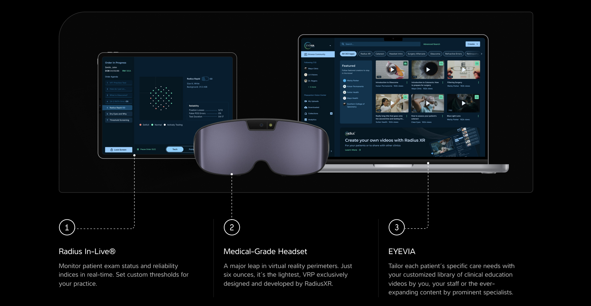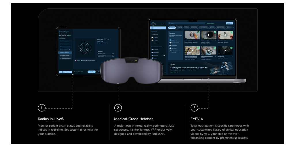 The Radius XR (www.RadiusXR.com) platform is a revolutionary portable vision diagnostic and patient engagement system. It combines medical-grade diagnostics, business management tools, and patient education resources within a wearable spatial computing device. The RadiusExam® and proprietary algorithms provide diagnostic testing results equivalent to current gold standards demonstrated through a clinical trial that shows statistical noninferiority of estimated sensitivities compared to SITA-Standard. This comprehensive digital health platform combines proprietary hardware and software to empower medical professionals to diagnose patients accurately, enhance patient engagement, and reduce staff workload. It enables patients to perform self-guided vision exams with minimal supervision, thereby aiding in the growth of eye care practices.